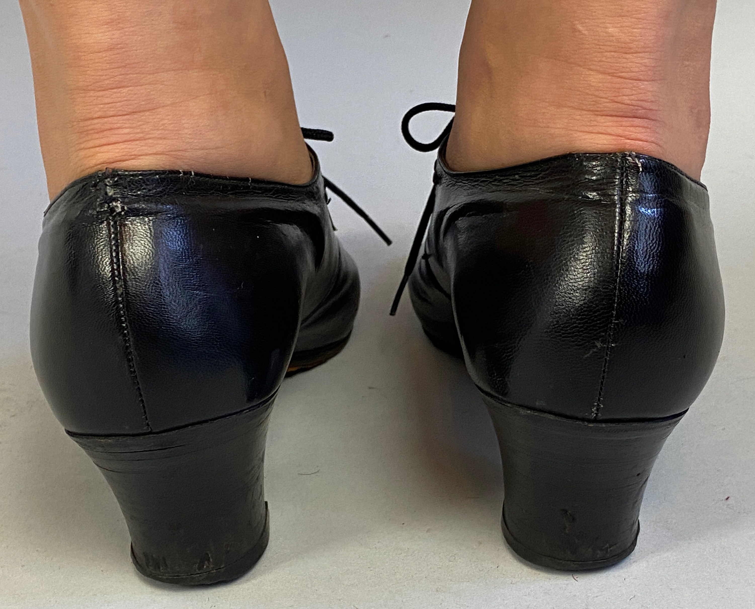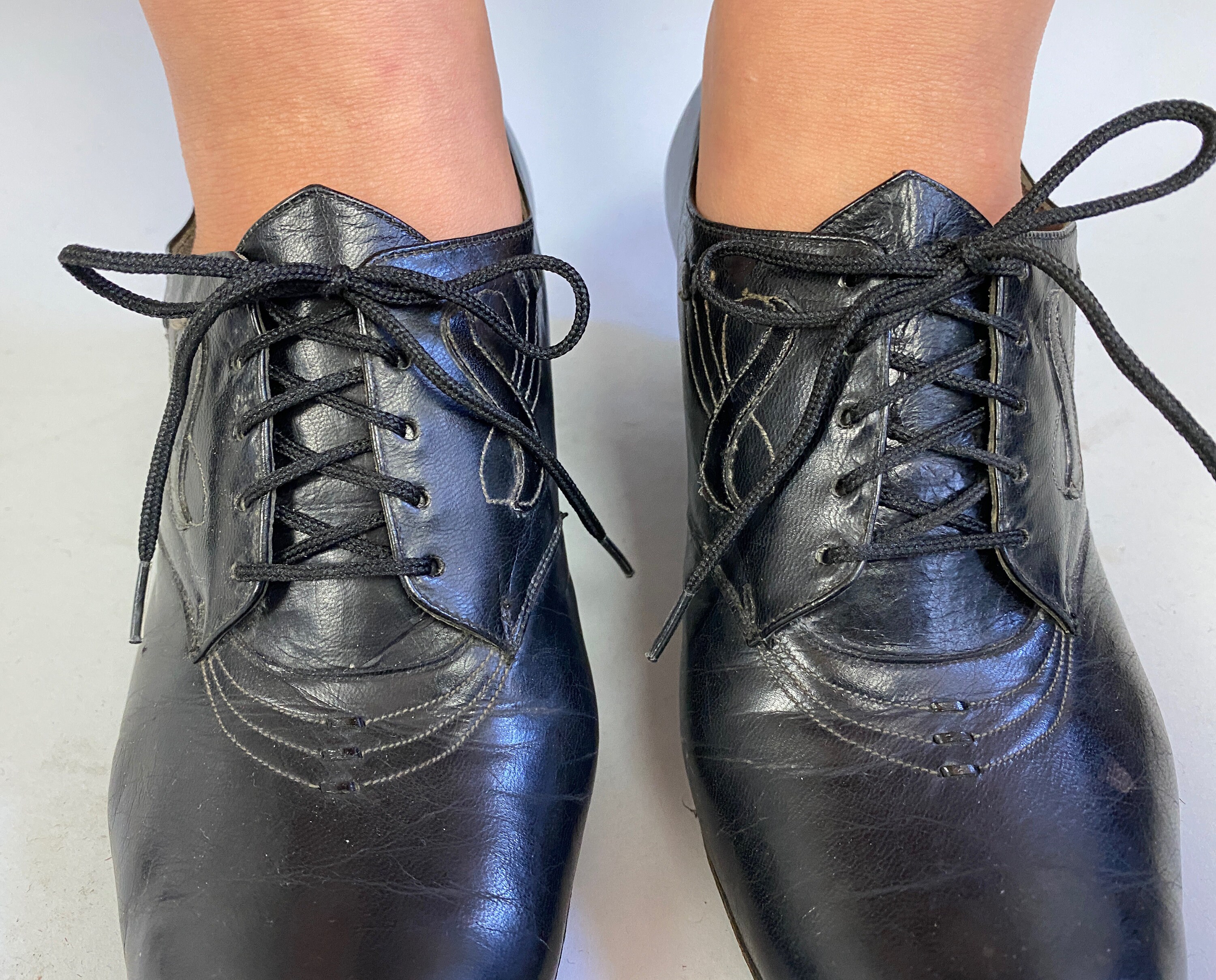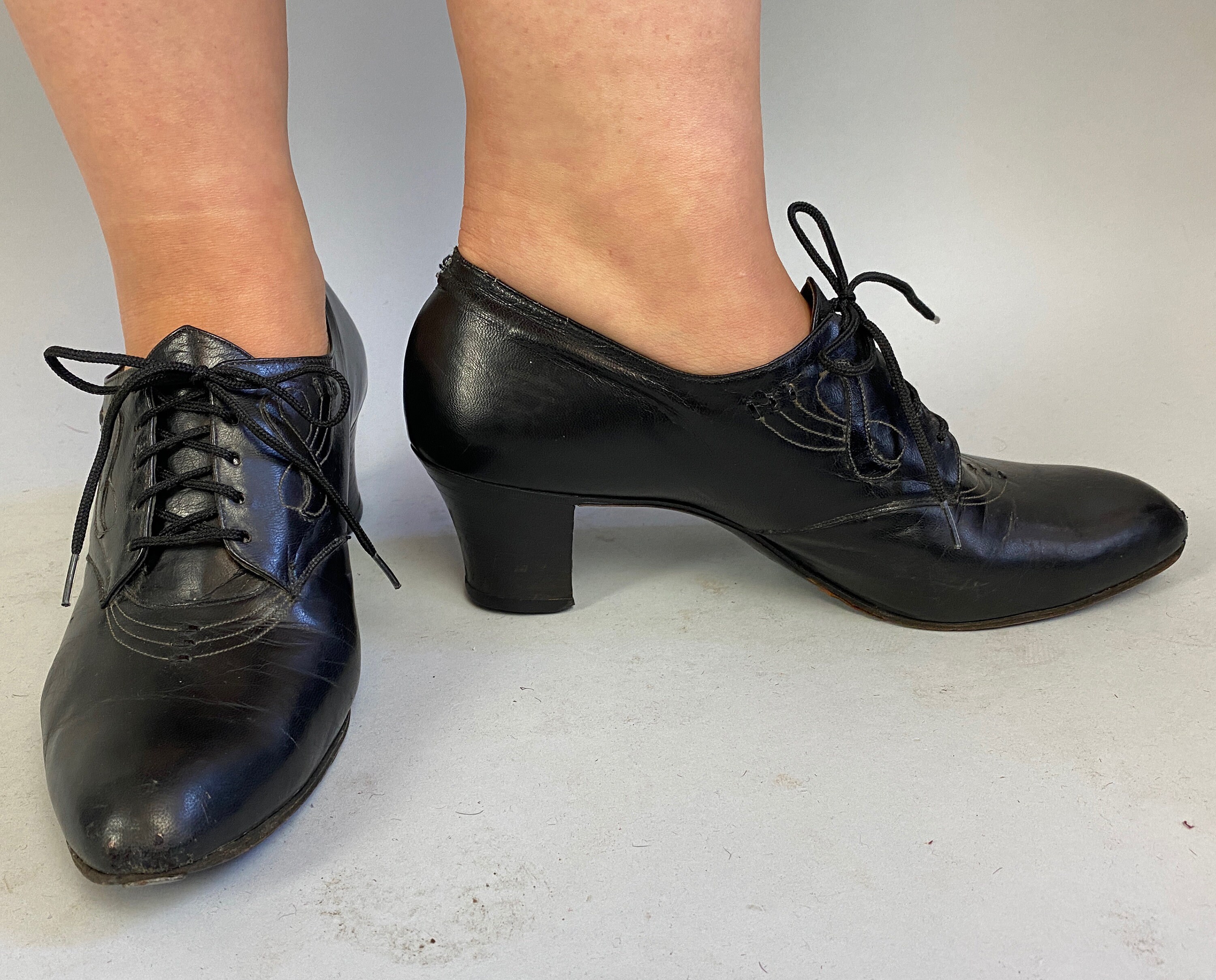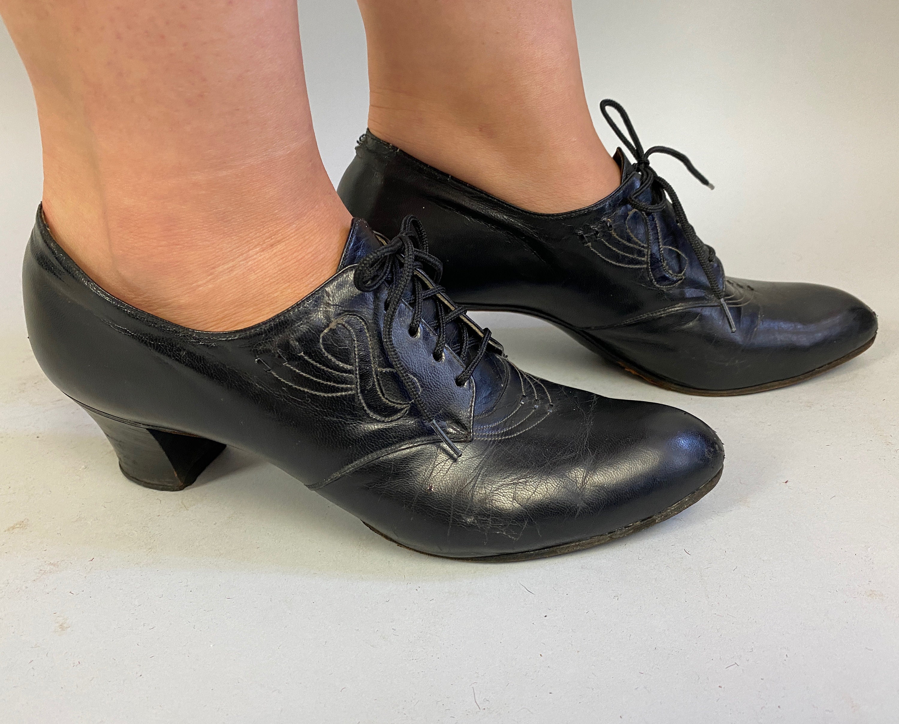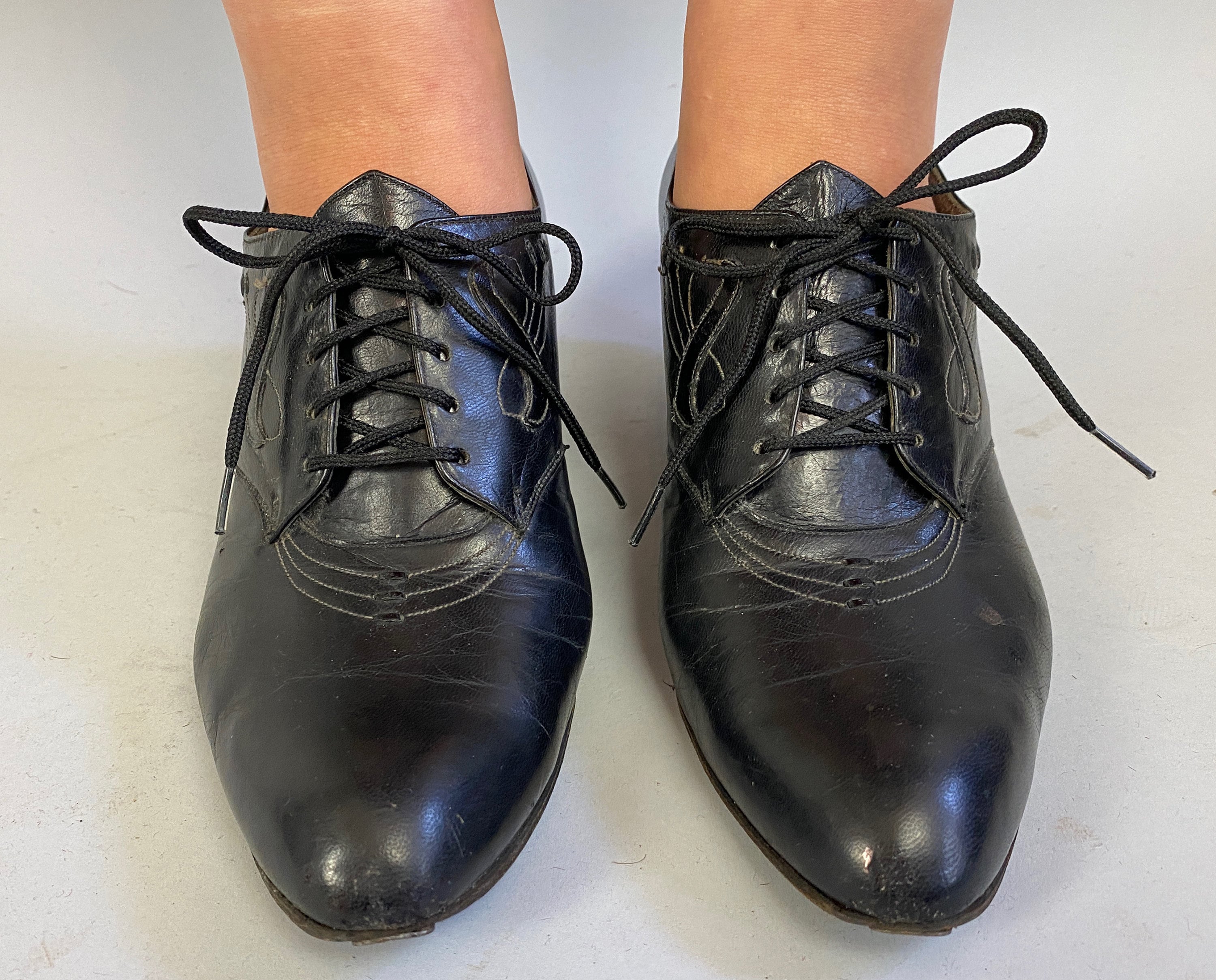 These classic Art Deco-era heeled oxfords are sure to be your new favorite dance shoes! Shoes feature white top stitching in elegant swirled designs, pointed toe, five hole laces, pointed tongue, comfortable stacked heel, leather soles, and toe taps. These shoes are in great vintage condition with slight age appropriate signs of wear.