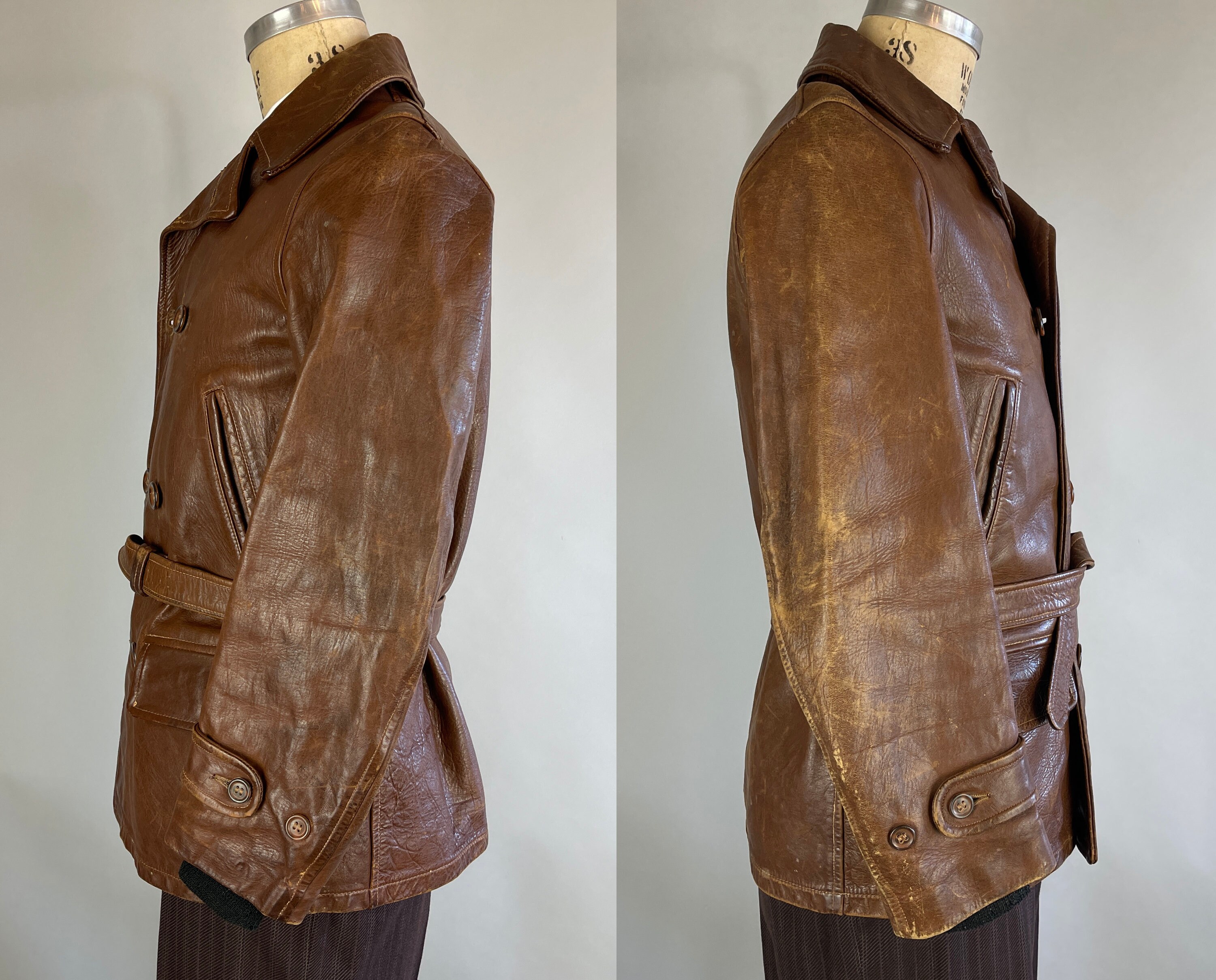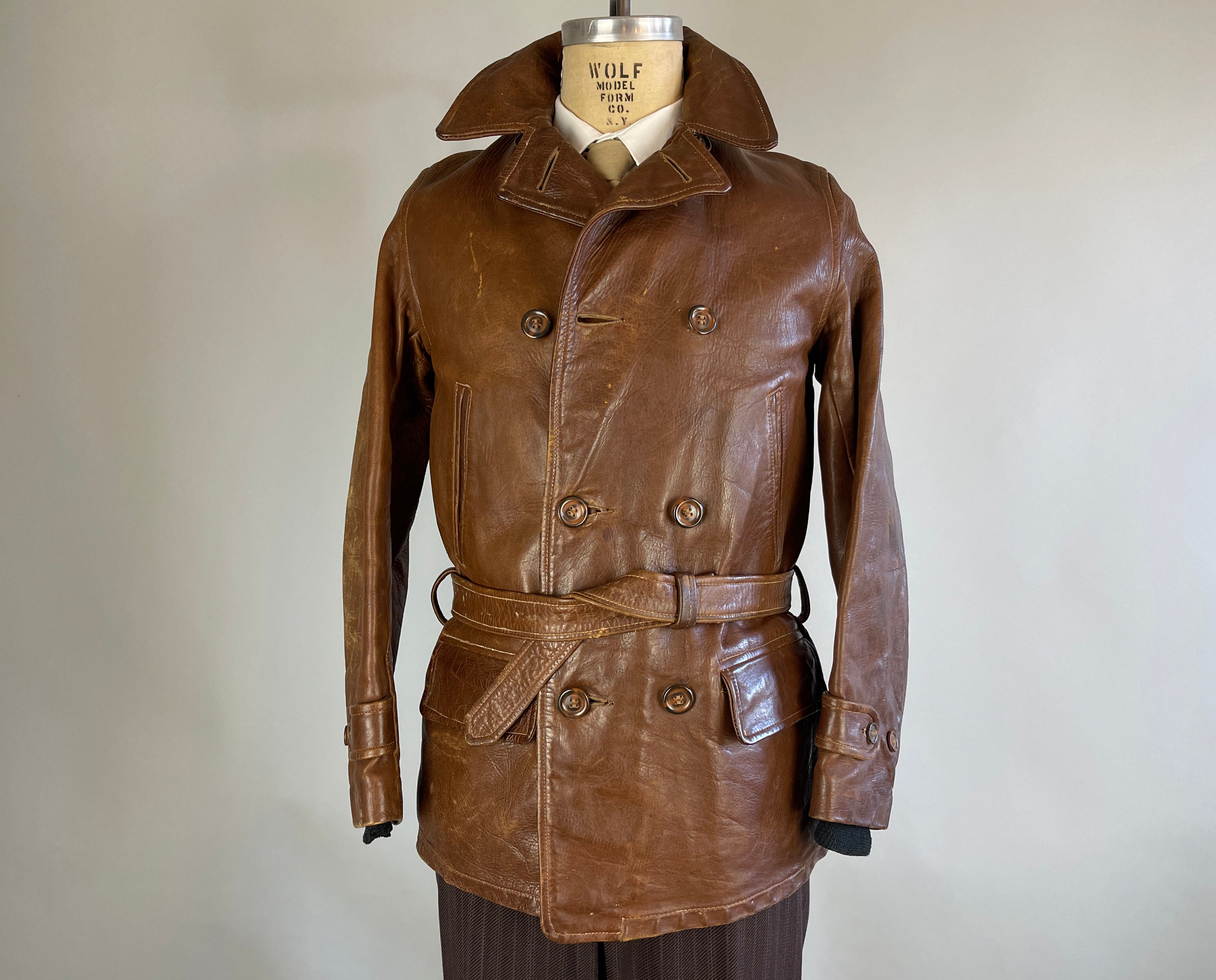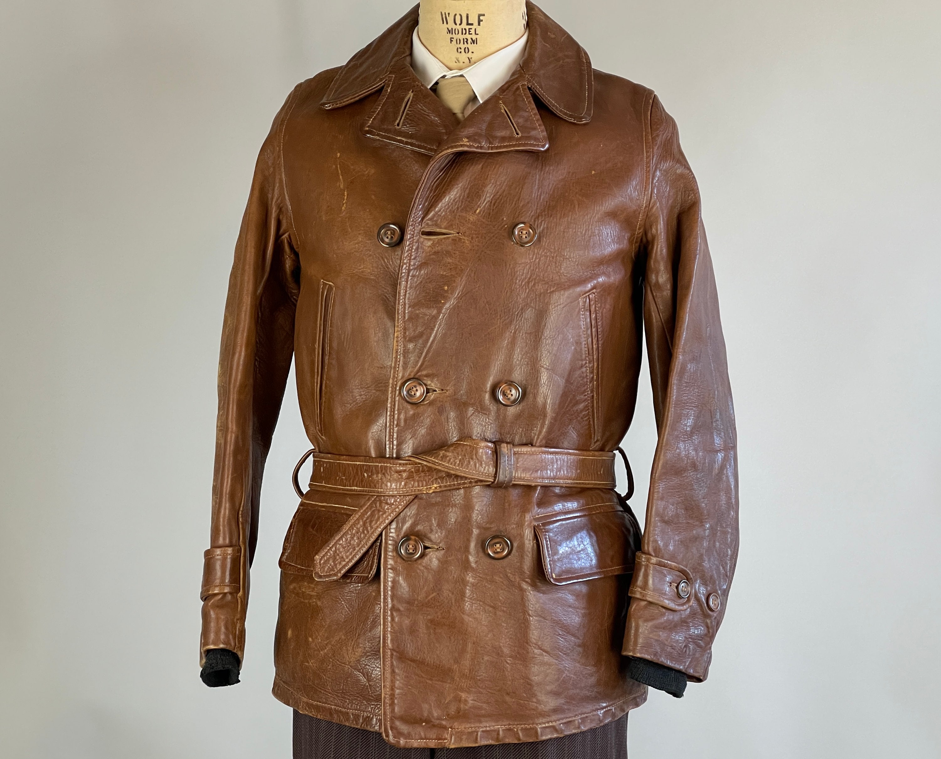 Stay home on the range or look terrific in town in this fantastic rare leather mackinaw! The genuine horsehide leather is a warm nutty brown with a beautiful patina and supple texture. Features double-breasted 3x6 closure of gorgeous brown marbled buttons, two flapped pockets at the hips lined in wool flannel, two amazing hand warmer pockets lined in the same, button tab cuffs each still including both matching marbled buttons and full removable belt. Pop the collar for some added style and protection from the elements. Lined in beautiful orange shadow plaid wool. By "Rogers Peet Company" of New York & Boston. This jacket is in great vintage condition, with no stains, holes, odors to note.