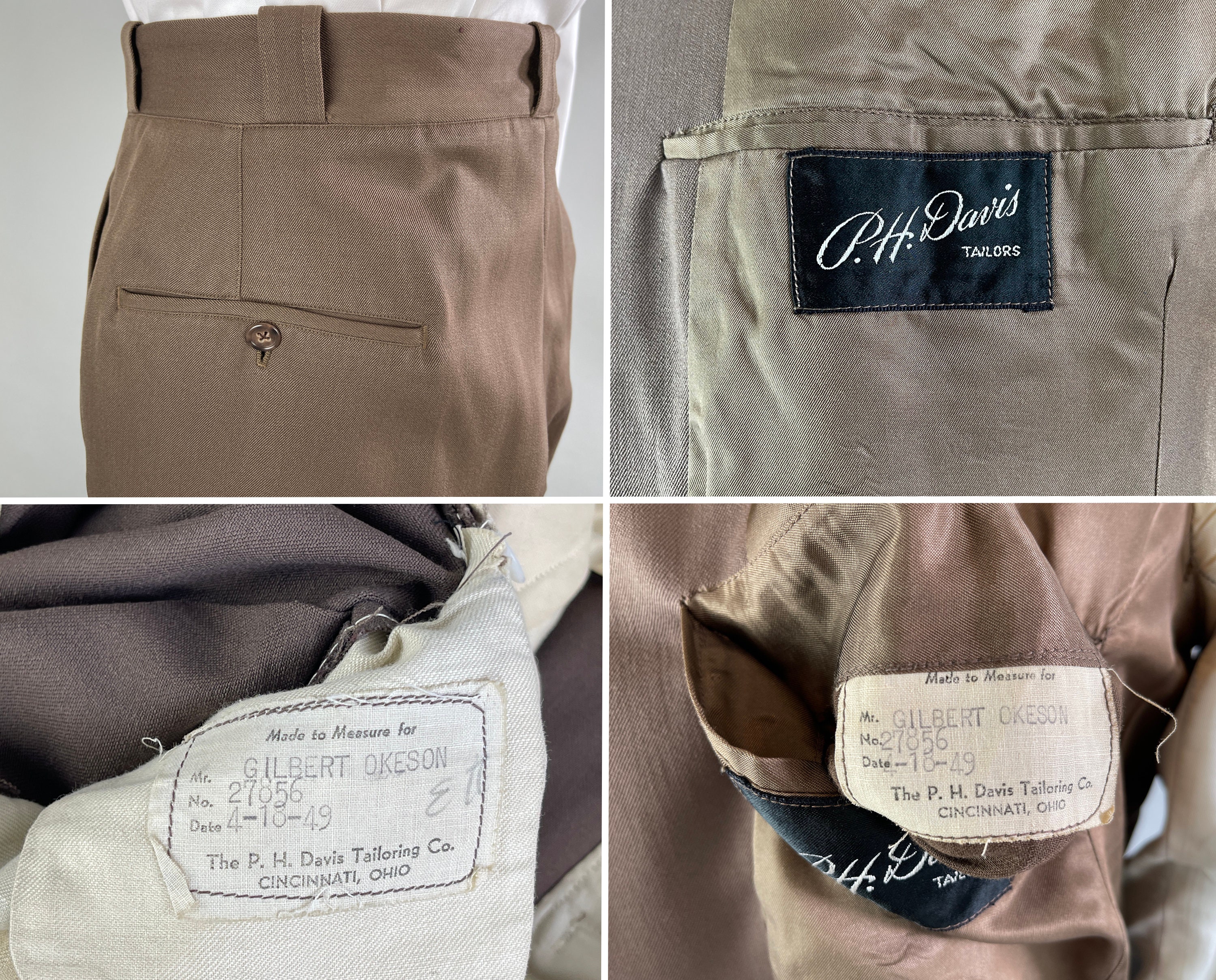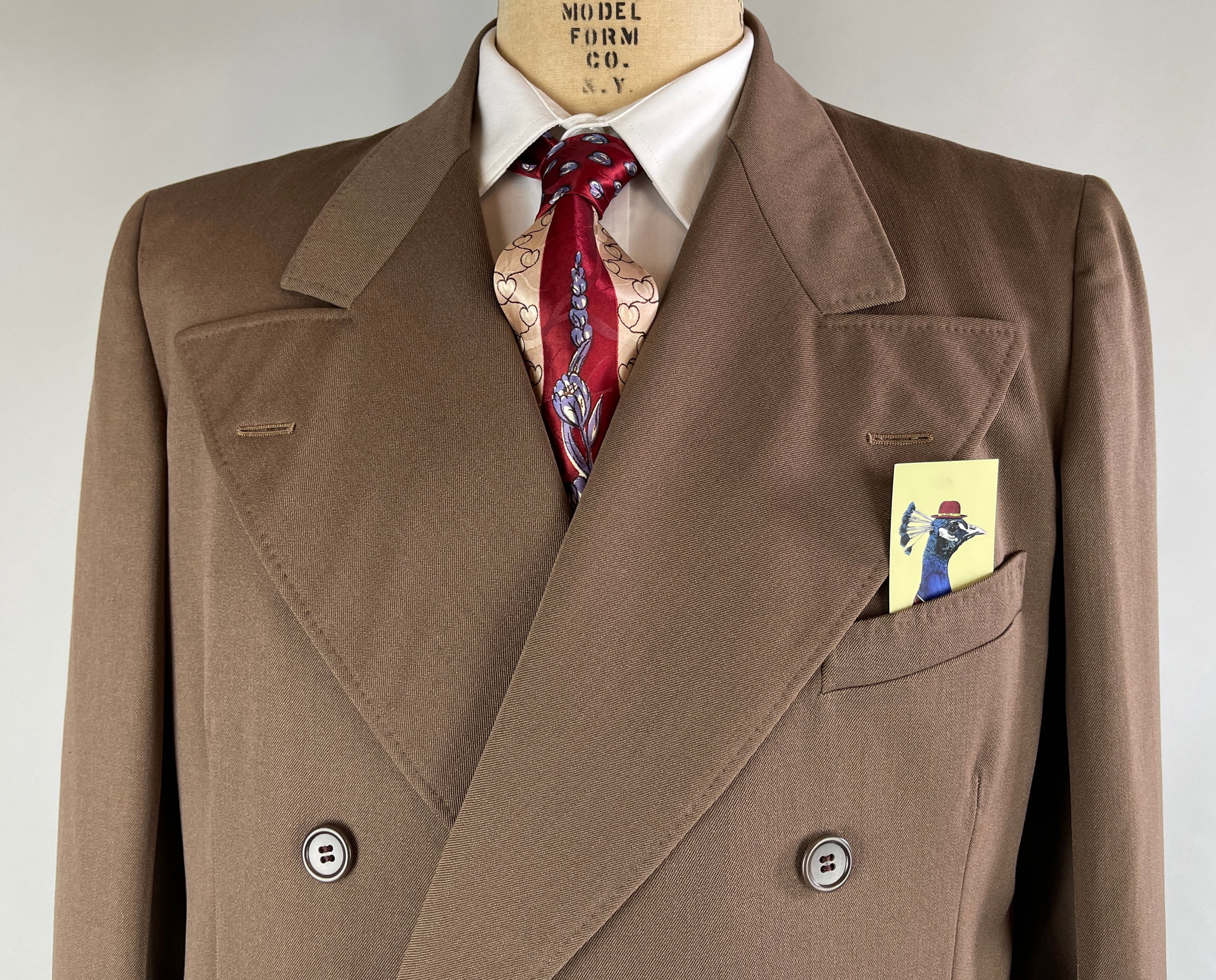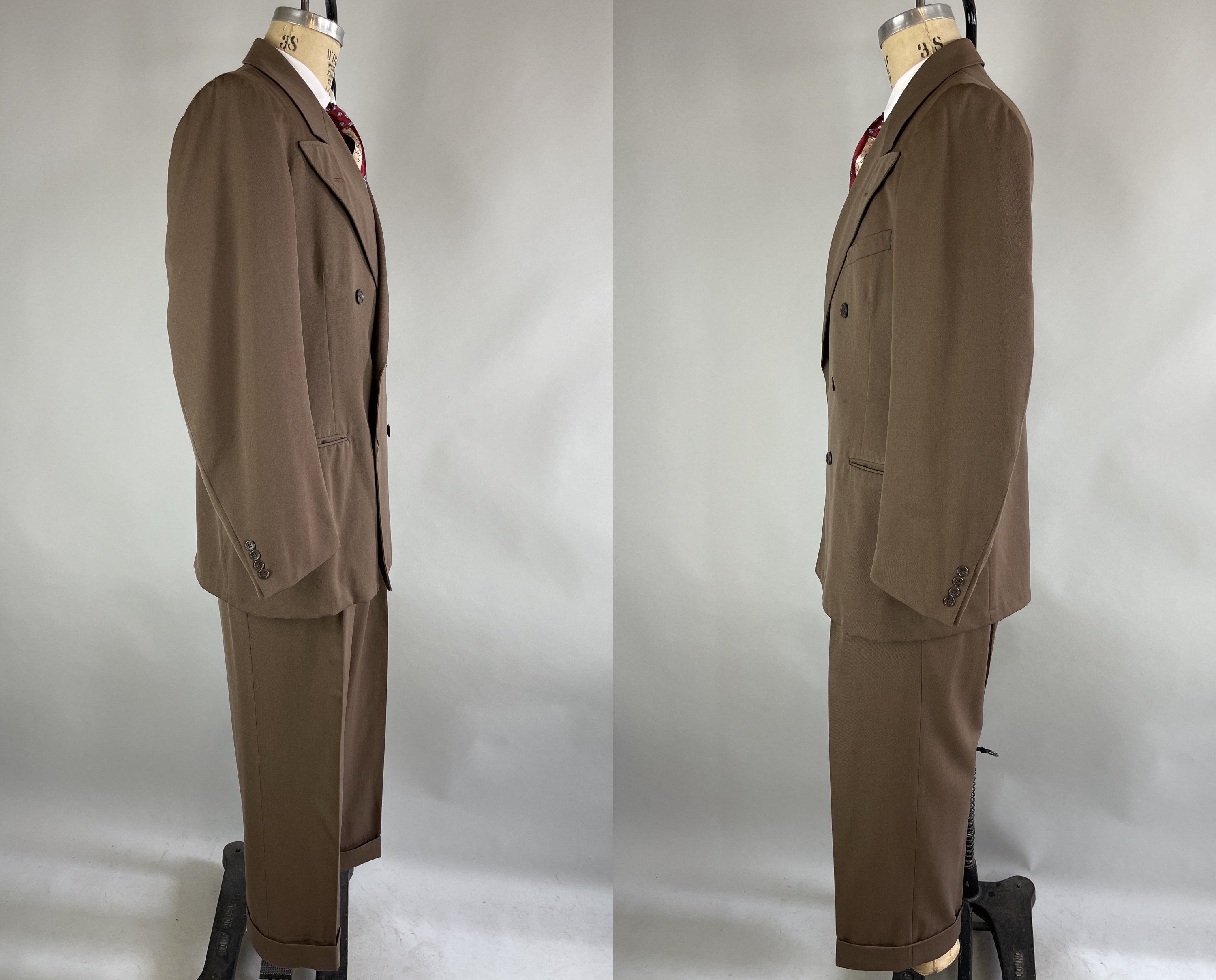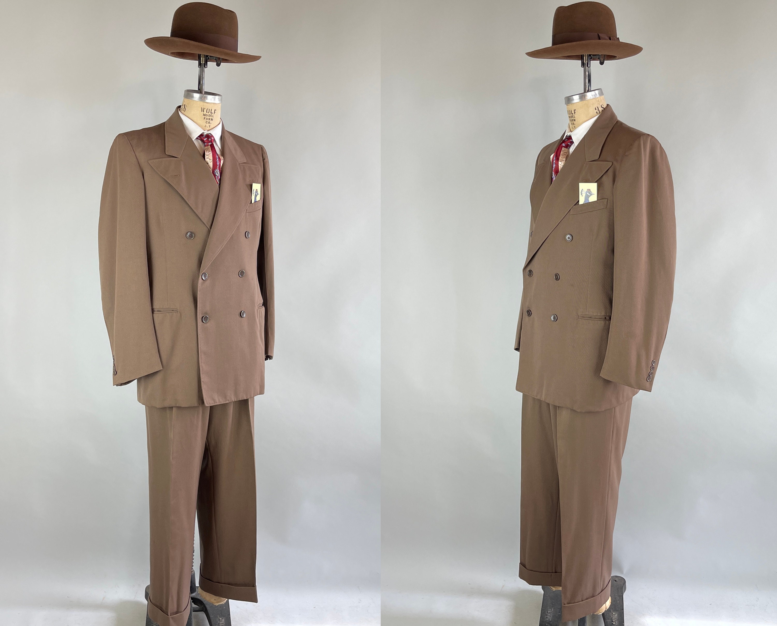 A handsome suit for a handsome gent, this 1940's classic will have you on par with Cary Grant! The wool of the suit is a decadent deep taupe brown with tone-on-tone topstitching. The jacket is double breasted with a half lining, peaked lapels, ventless back, three outer welted pockets, and two inner pockets. The trousers have a pleated front, inner suspender buttons, four welted pockets with both back pockets buttoning, and cuffed hems. From “P.H. Davis Tailors” of Cincinnati, Ohio and dated 4-18-49 on both the jacket and trousers! This suit is in excellent vintage condition with no holes, stains, or odors to note.