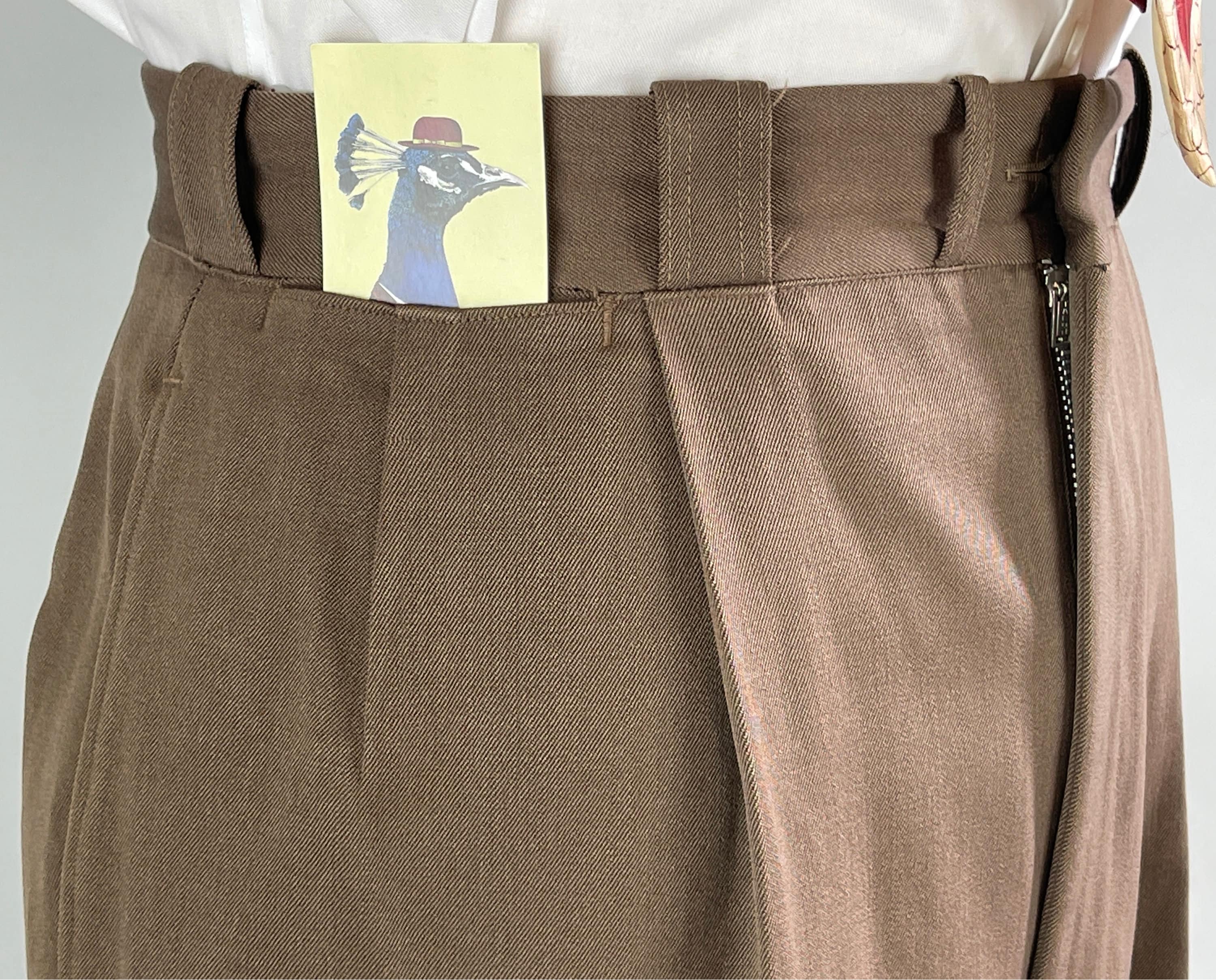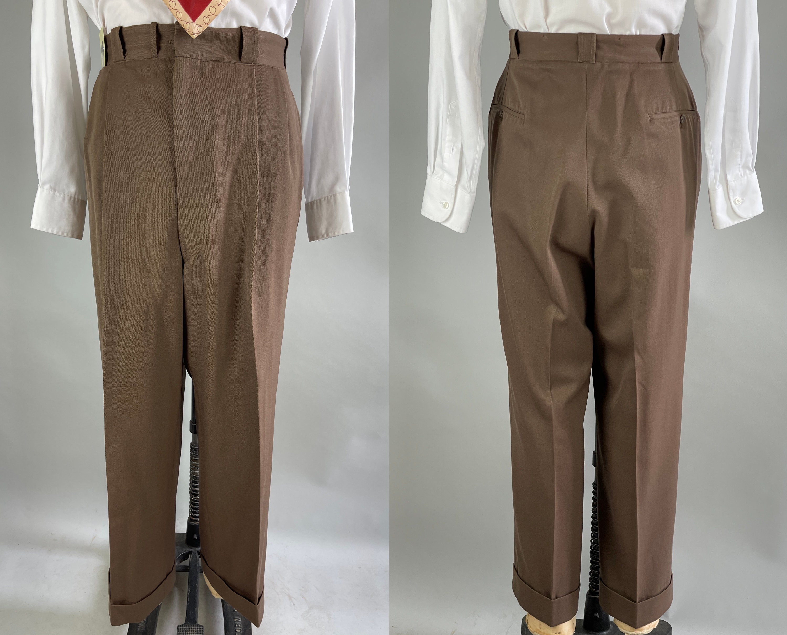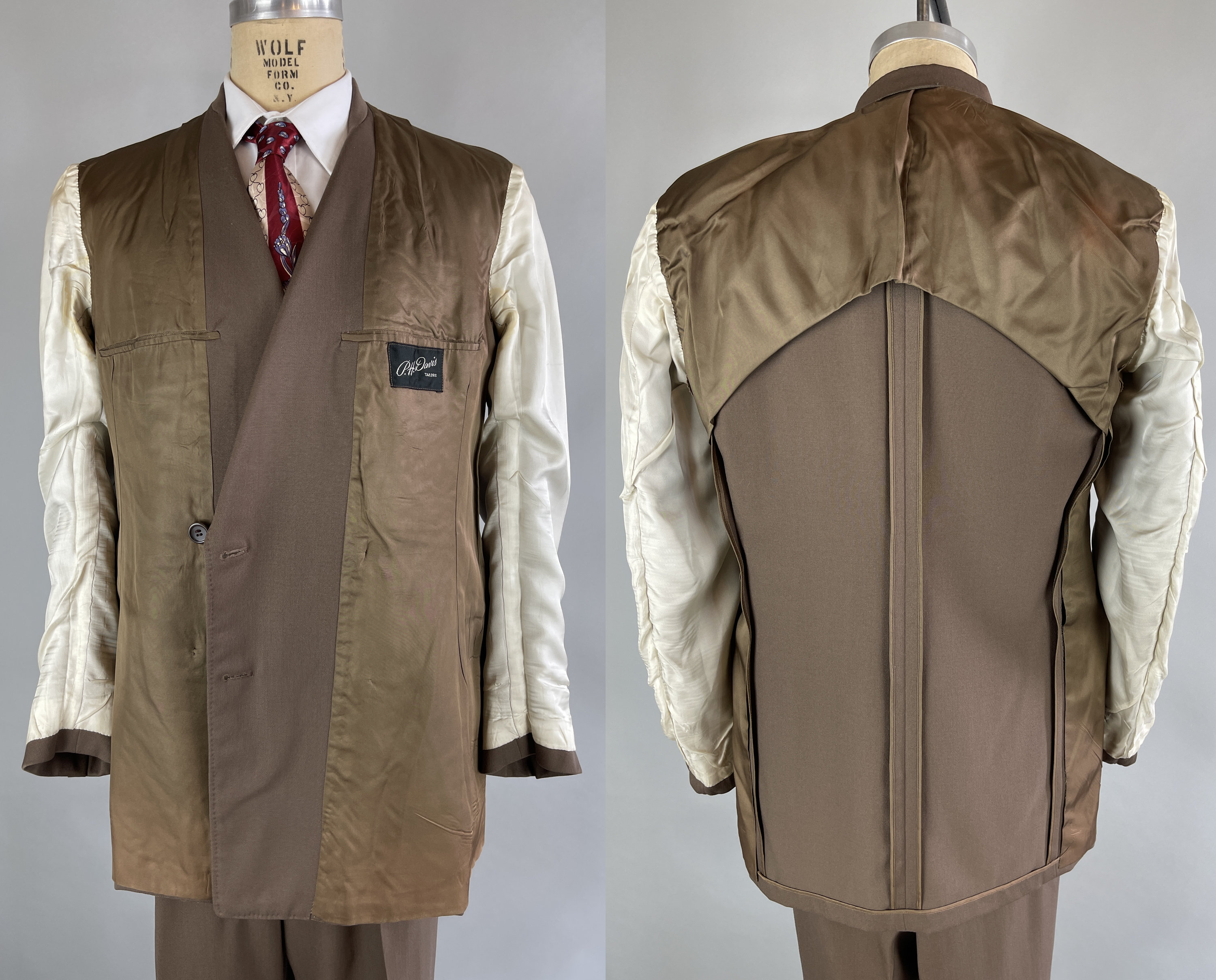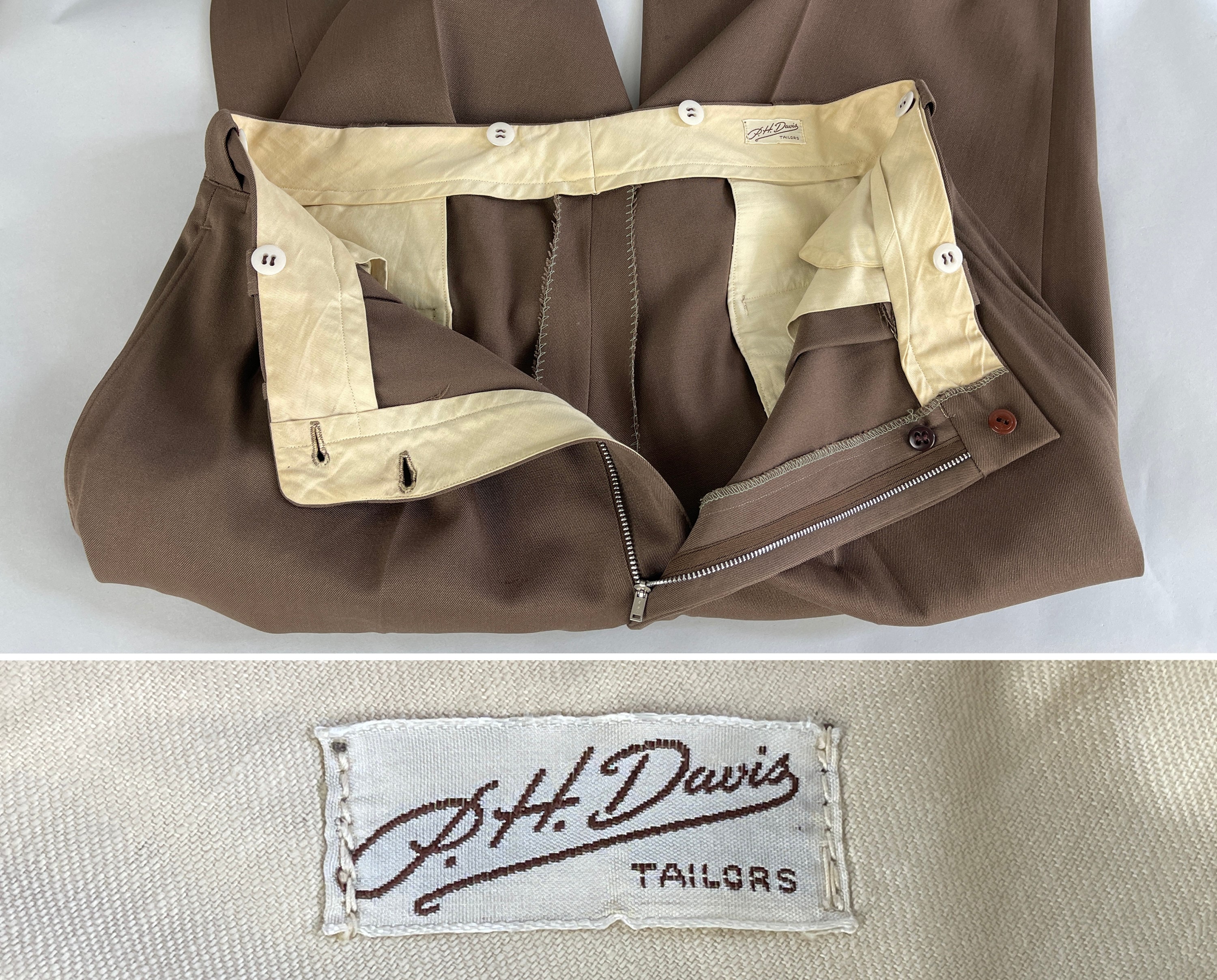 A handsome suit for a handsome gent, this 1940's classic will have you on par with Cary Grant! The wool of the suit is a decadent deep taupe brown with tone-on-tone topstitching. The jacket is double breasted with a half lining, peaked lapels, ventless back, three outer welted pockets, and two inner pockets. The trousers have a pleated front, inner suspender buttons, four welted pockets with both back pockets buttoning, and cuffed hems. From “P.H. Davis Tailors” of Cincinnati, Ohio and dated 4-18-49 on both the jacket and trousers! This suit is in excellent vintage condition with no holes, stains, or odors to note.