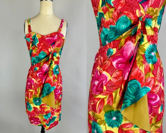 1940s Tantalizing Tiki Dress | Vintage 40s Black Floral Yellow Green Orange Brown Tropical Strapless Hawaiian Sarong Frock | Extra Small XS