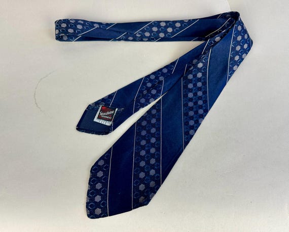 1940s Shine on You Crazy Diamond Necktie | Vintage 40s Blue Silk Brocade Self Tie with Diamond Jewels Print in White and Yellow by 'Brent'